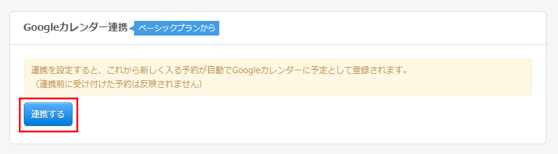 まだGoogleカレンダーとの連携が完了していない場合は、「連携する」ボタンから設定を行ってください。