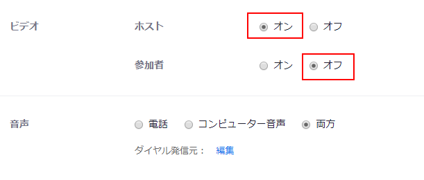 ビデオはホストを「オン」参加者は「オフ」を選択します。 ⇒ 管理者の映像のみ画面に表示されるようになります