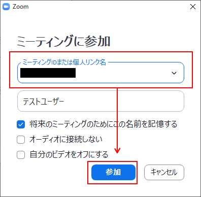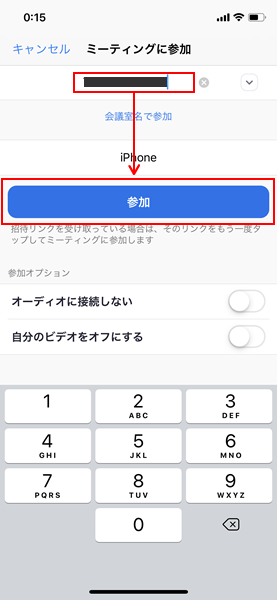 ミーティングに参加画面にて招待メールに記載の「ミーティングID」を入力して「参加」をクリックします。