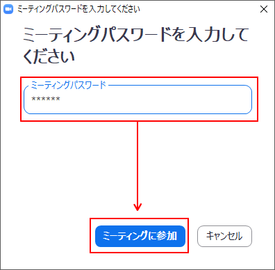 同じく招待メールに記載のミーティングパスワードを入力して「ミーティングに参加」をクリックします。