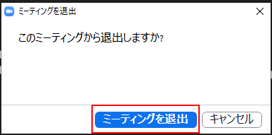 「このミーティングから退出しますか?」が表示されますので「ミーティングを退出」をクリックすると終了します。