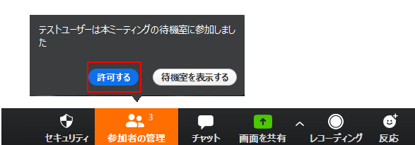 お客様から参加リクエストが入るとミーティング画面の「参加者の管理」に承認用のダイアログが表示されますので