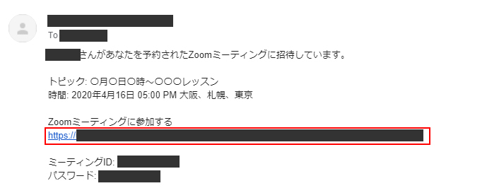 「招待状をコピーする」をクリックするとレッスン受講に必要な開催日時、受講用URL、パスワード情報が表示され