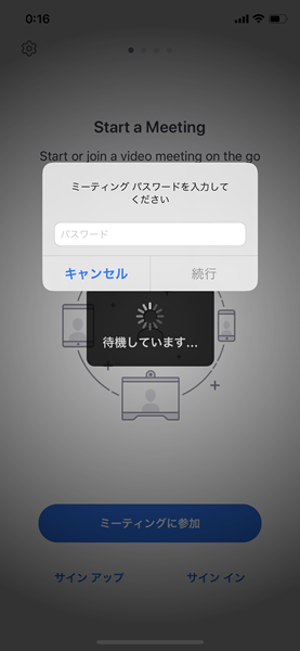 同じく招待メールに記載のミーティングパスワードを入力して「続行」をクリックします。