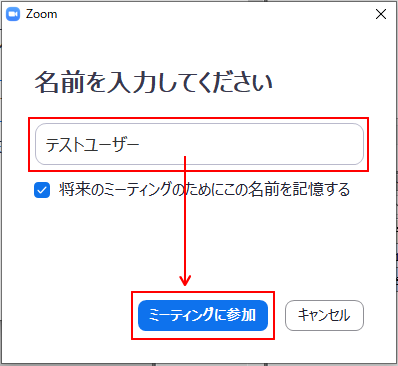 名前を入力して「ミーティングに参加」ボタンをクリックします。