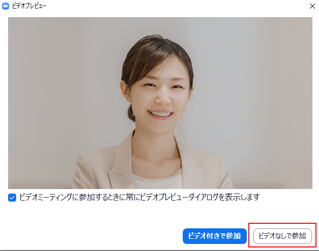 「ビデオ無しで参加」をクリックします。