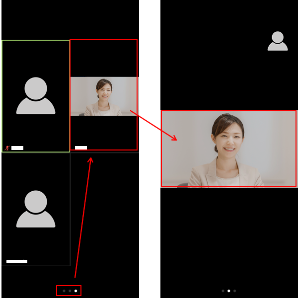 スマートフォンの場合、画面を左にスライドすると参加者の映像が確認できますう。指定した映像がメインに表示されるようになります。