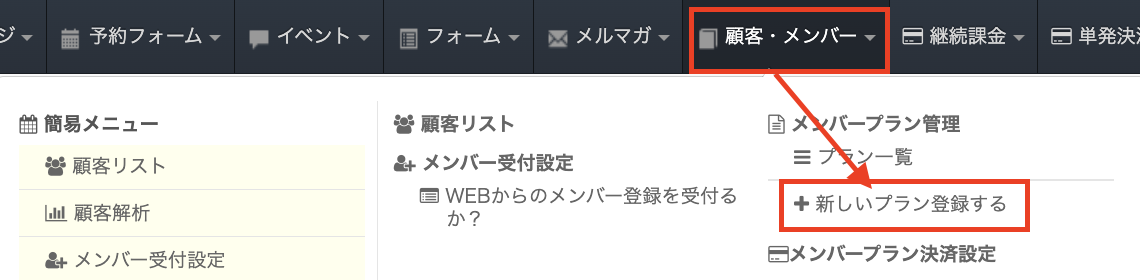 メニューより「顧客・メンバー」を選択し、「新しいプラン登録する」をクリックします。