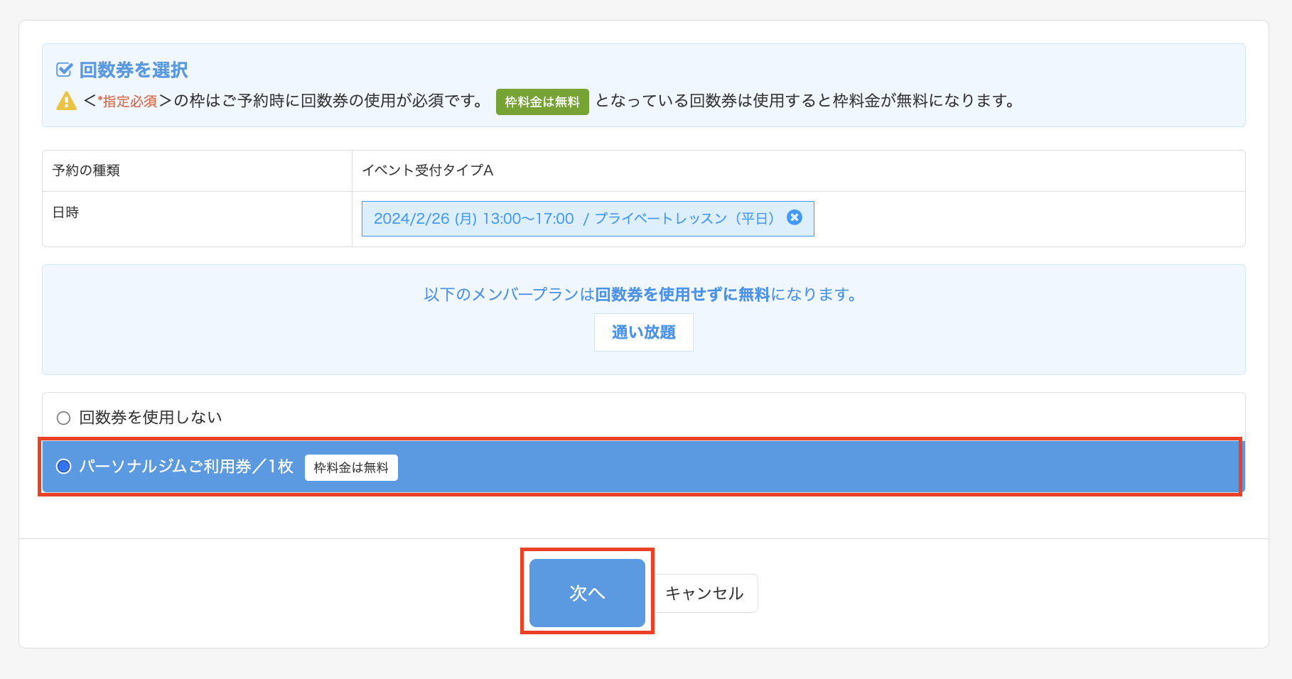 回数券選択画面が表示されます。回数券を選択し、「次へ」をクリックします。