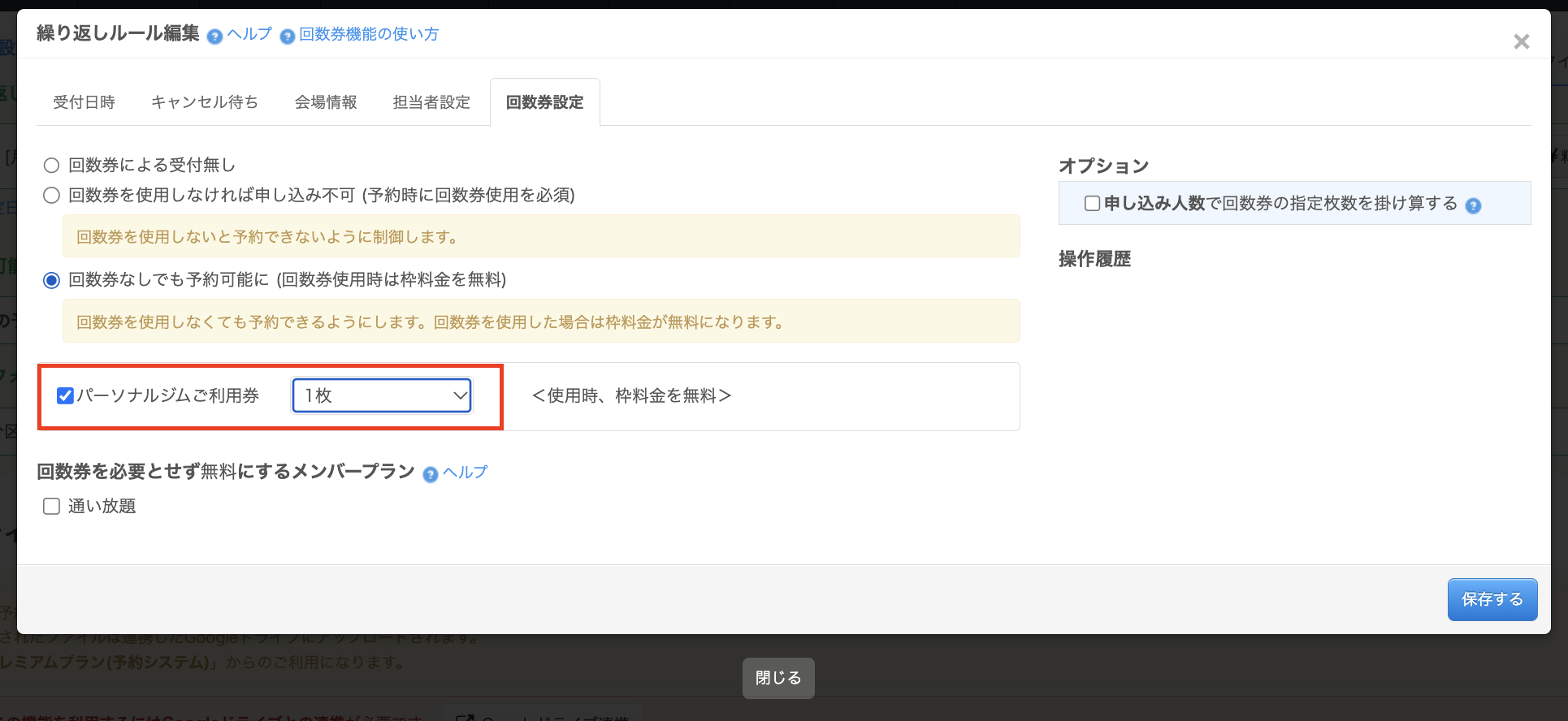 どなたでも予約可能で、回数券をお持ちの方は利用料金が発生しない受付を可能とする場合は「回数券なしでも予約可能に(回数券使用時は枠料金を無料)」をクリックします。