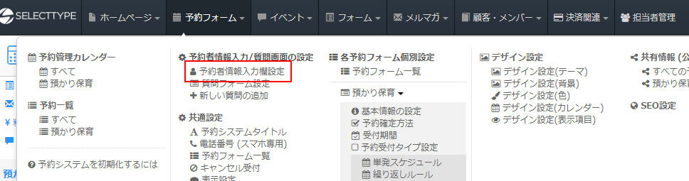 ページ上部「予約フォーム」⇒「予約者情報入力設定」をクリックします。