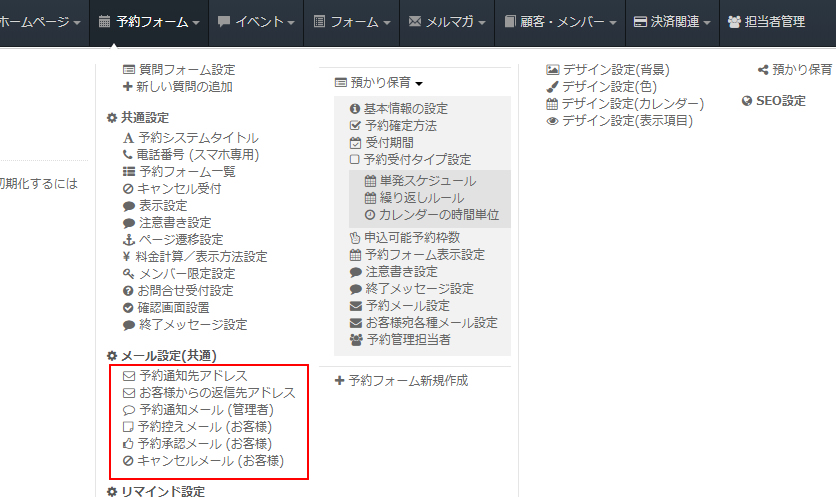 SELECTTYPEから予約に関するメールの設定は「予約メール設定」にて各種設定が行えます。
