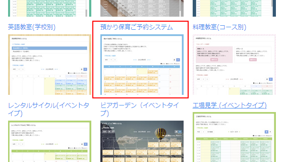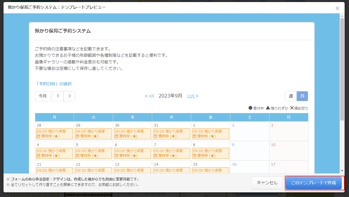 預かり保育用にセットアップされたテンプレートもご用意していますので、ご希望の予約フォームに近いテンプレートから作成を開始します。