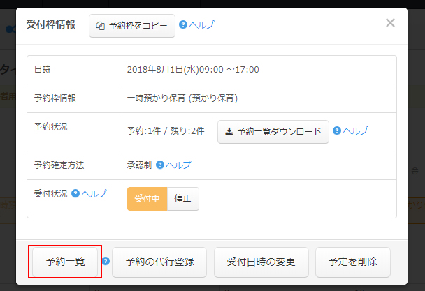 予約管理カレンダーに戻り、先程登録をした受付枠情報から「予約一覧」をクリックするとその枠の予約情報が確認できます。
