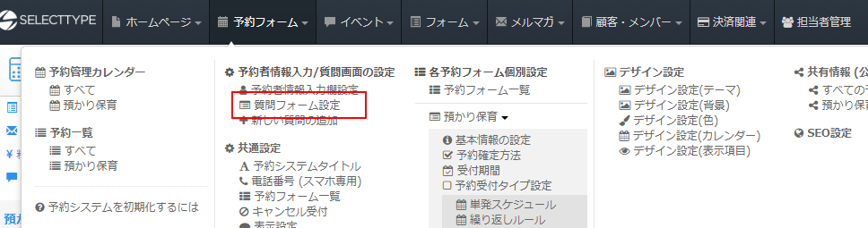 ヘッダーメニュー「予約フォーム」より「質問フォーム設定」をクリックします。