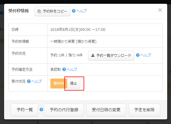 受付状況にて停止ボタンをクリックすると、その枠の受付が停止されカレンダーから受付枠の表示が非表示になります。