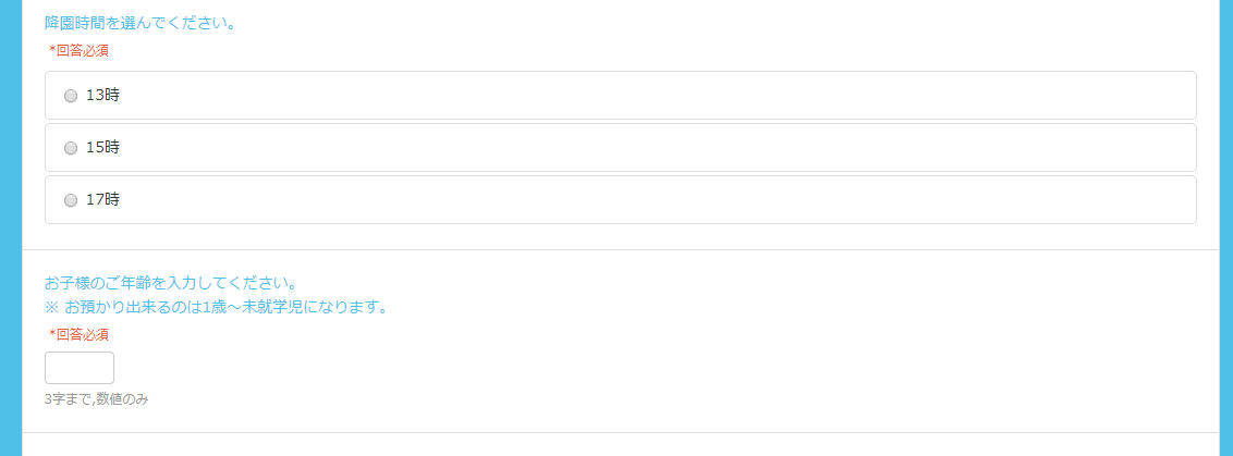 この機能を使用して降園時間を選んでもらう質問フォームを設置してみます。