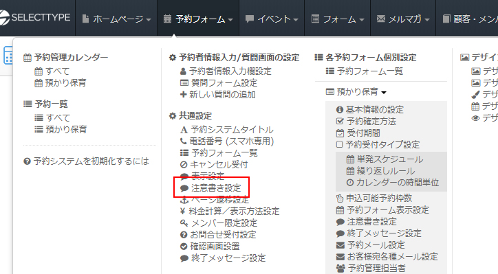 ヘッダーメニューの「予約フォーム」⇒「各予約フォーム個別設定」の「注意書き設定」をクリックします。