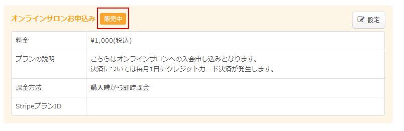 メンバープラン決済設定の登録されたプラン情報エリアには、販売設定が有効になっているプランに「販売中」のラベルが表示されます。