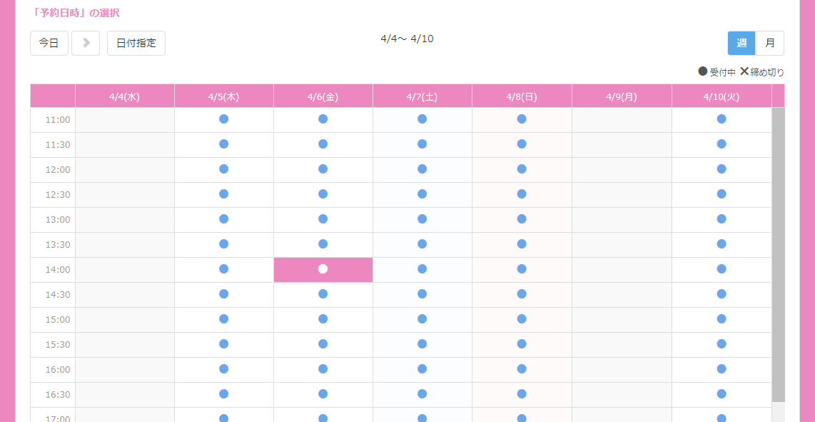 「11時から21時まで30分区切りの時刻で予約を受付ける」予約カレンダーを作成できます。