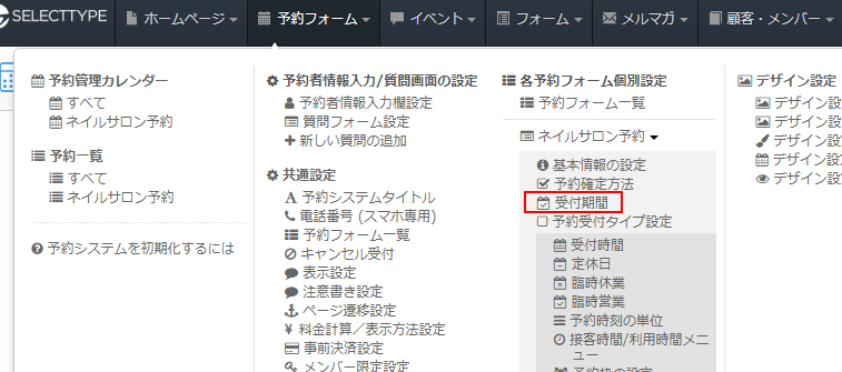 SELECTTYPEから予約に関するメールの設定は「予約メール設定」にて各種設定が行えます。
