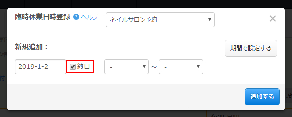 予約受付を始めると、急遽予約を受付が出来なくなる日もでてくると思います。そのような場合には臨時休業日時設定を使用します。