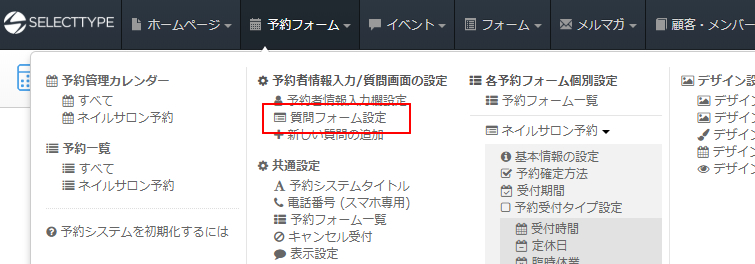 上部メニューの「予約フォーム」⇒「質問フォーム設定」をクリックします。