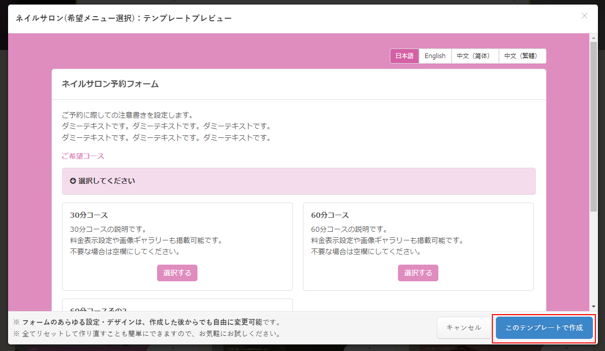 この記事でご紹介するテンプレートは「ネイルサロン(希望メニュー選択)」のテンプレートになります。
