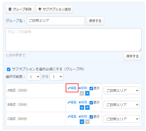 サブオプション機能を使用して訪問先エリアによって所要時間を設定できるので柔軟な予約受付が可能になります。