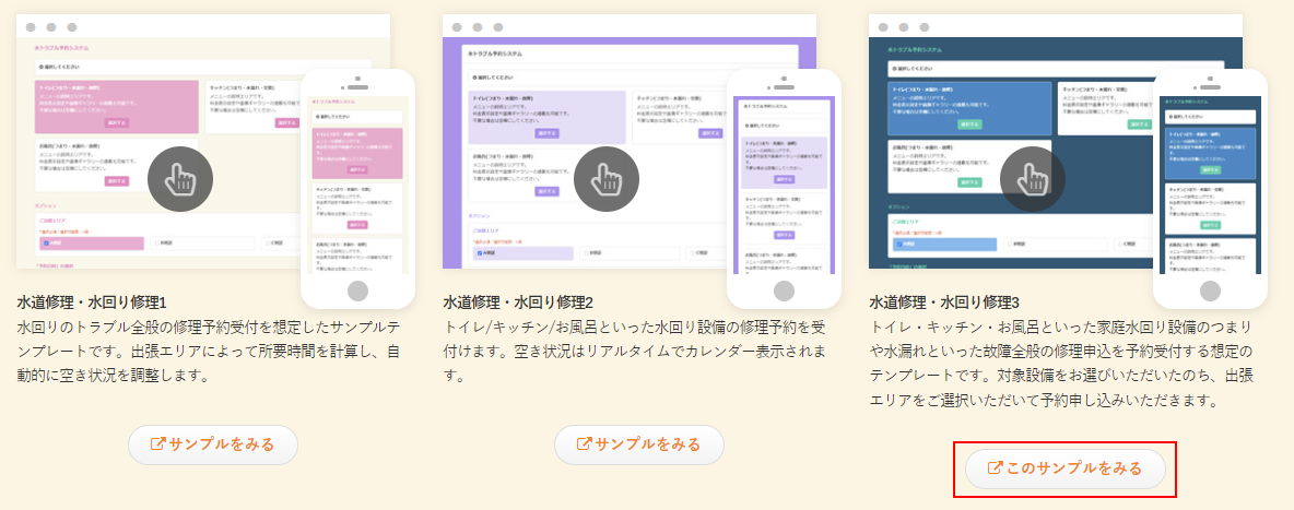 予約システムの紹介ページからもテンプレートを選んで作成できます。