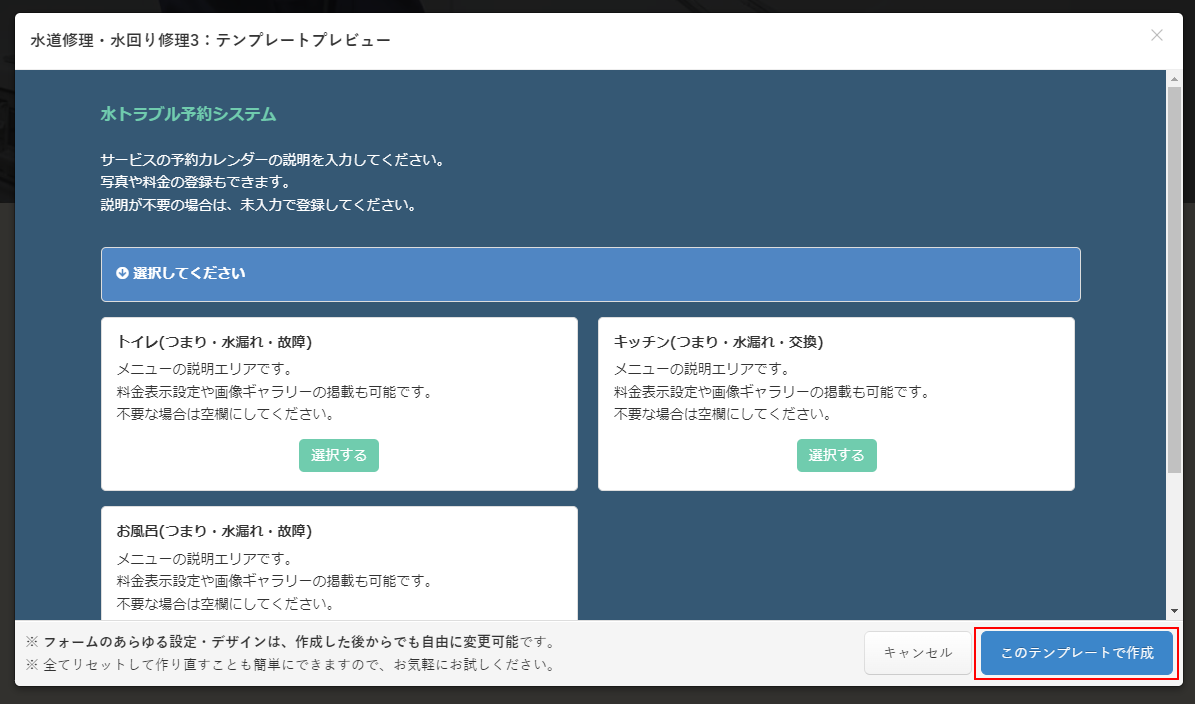 「このテンプレートで作成」をクリックしますと予約フォームが仮のデータで作成されますので利用されるサービスにあわせて調整していきましょう。