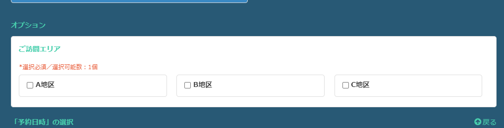 「ご訪問エリア」というグループの中に「A地区、B地区、C地区」のオプションがありますので、