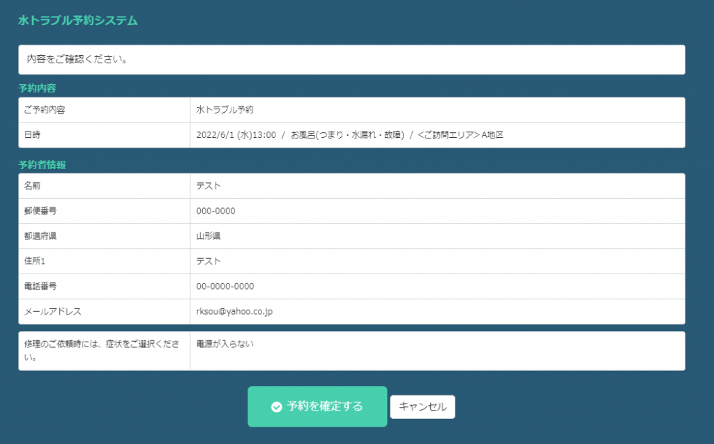 登録が完了すると、登録した予約情報の詳細画面が表示されます。