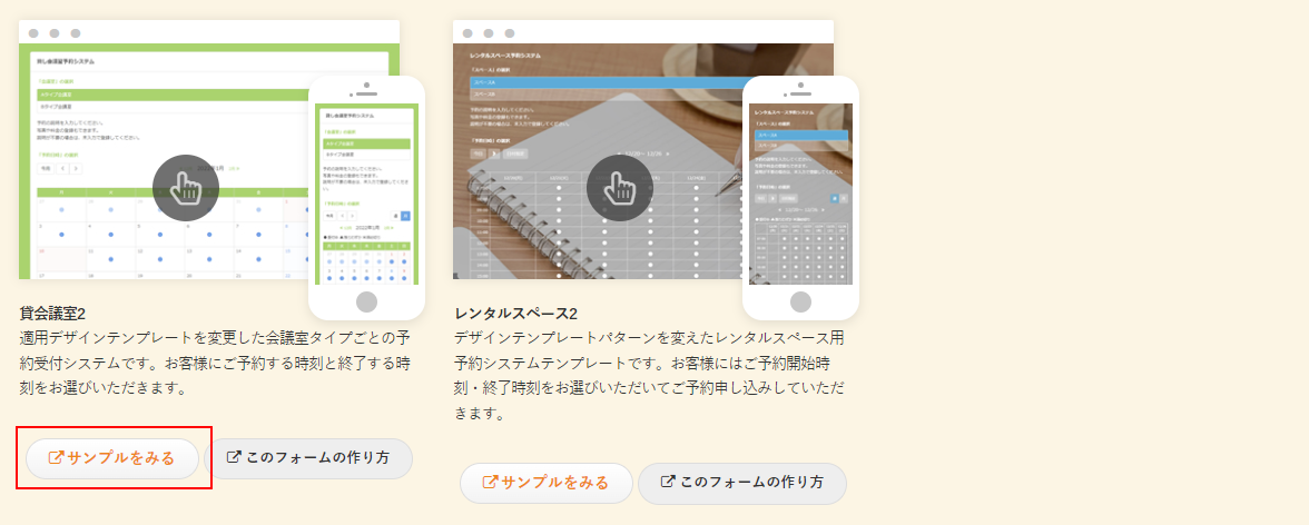 今回は「営業時間受付タイプ」のテンプレートの中から「貸会議室2」のテンプレートを選びます。