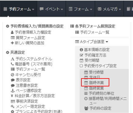 設定はヘッダーメニュー「予約フォーム」⇒「各予約フォーム個別設定/臨時休業」をクリックします。
