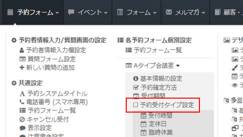 上部メニュー「予約フォーム」→「各予約フォーム個別設定/フォームタイトル/予約受付タイプ設定」をクリックします。