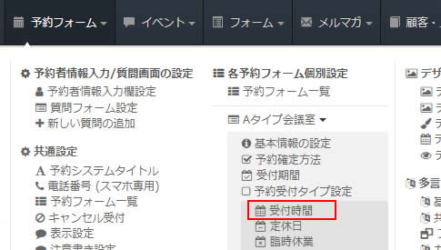 ヘッダーメニューの「予約フォーム」⇒「各予約フォーム個別設定」の「受付時間」をクリックします。