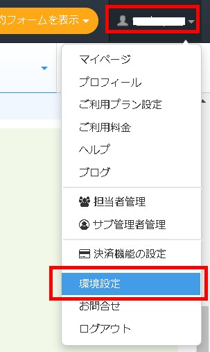 ページ上部ヘッダーの右端より[アカウント登録メールアドレス]→「環境設定」とクリックして環境設定画面へ移動します。