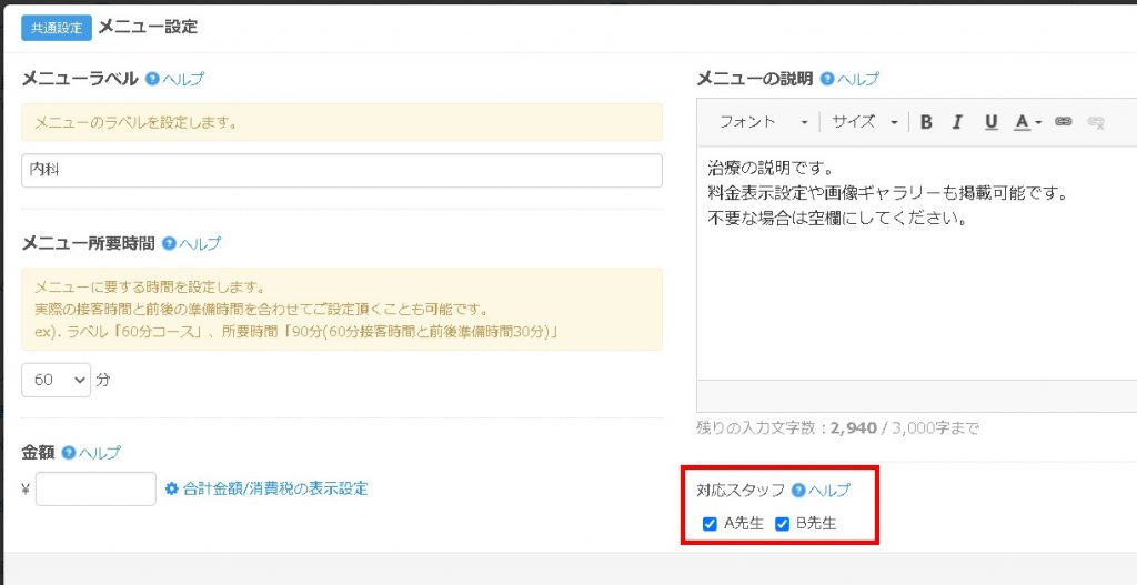 メニューごとに対応可能な医師(スタッフ)を指定することが出来ます。
