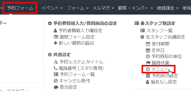 メニュー設定エリアには、ページ上部ヘッダーより「予約フォーム」→「全スタッフ共通設定」で移動します。