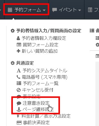 設定画面はヘッダーより「予約フォーム」→「注意書き設定」とクリックして移動出来ます。