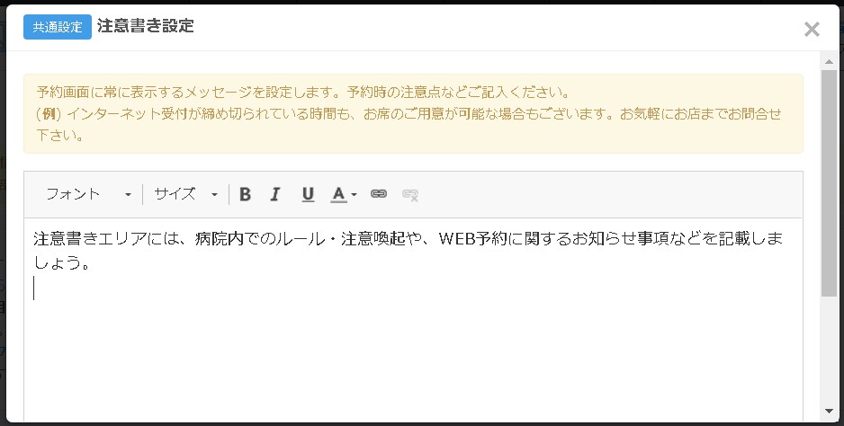 注意書きエリアには、WEBからの予約に際しての注意書きを記載します。