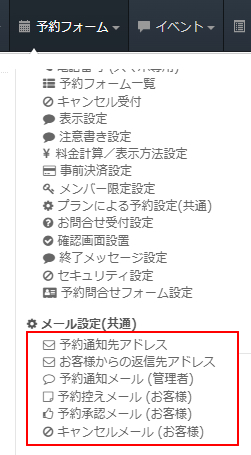SELECTTYPEから予約に関するメールの設定は上部メニュー「予約フォーム」→「メール設定(共通)」にて各種設定が行えます。