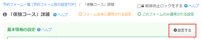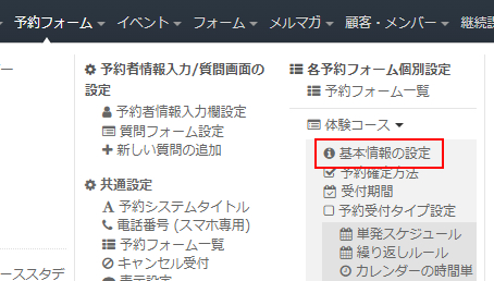 ヘッダーメニューの「予約フォーム」⇒「各予約フォーム個別設定」の「基本情報の設定」をクリックします。