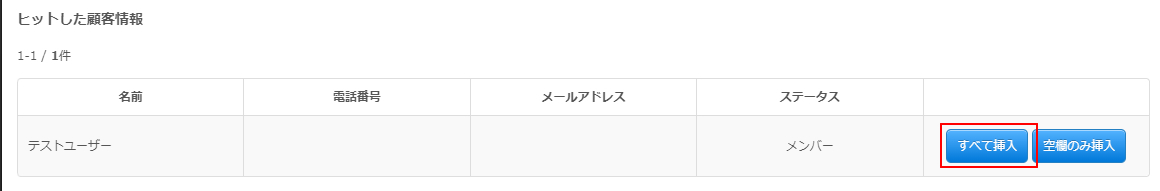 特定した情報の「すべて挿入」ボタンをクリックしますと、顧客リストに登録されている情報が登録フォームに挿入されます。