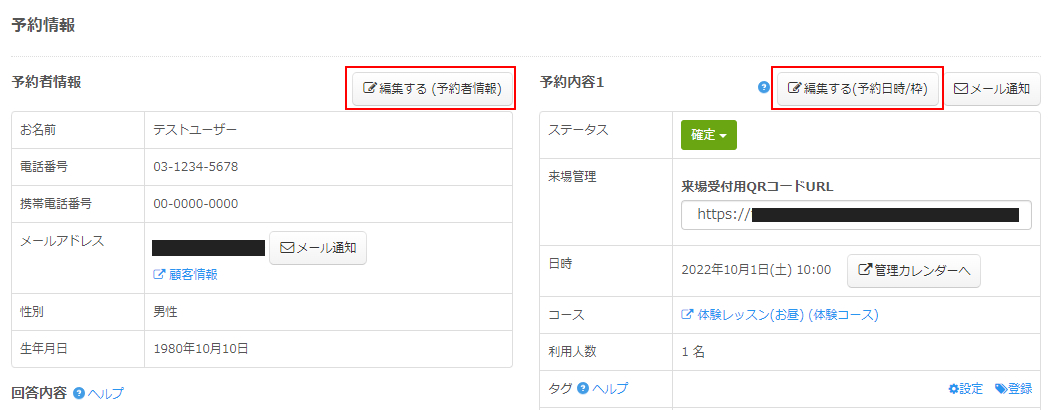 予約者情報詳細画面が表示されますので、登録された情報が反映されているか確認しましょう。