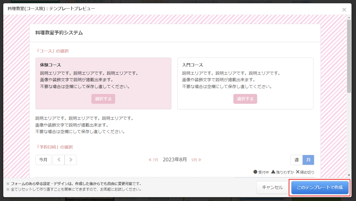 「テンプレートプレビュー」で予約フォームを確認することができます。