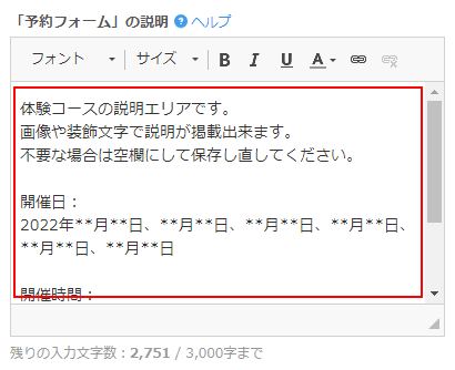 「「予約フォーム」の説明」にはコースの概要や開催スケジュール、定員などの情報を登録します。