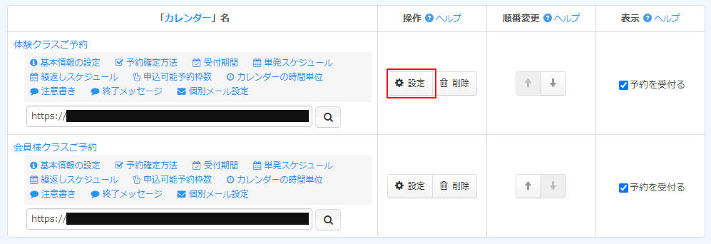 続いて「限定されている予約フォーム」の「設定」ボタンをクリックします