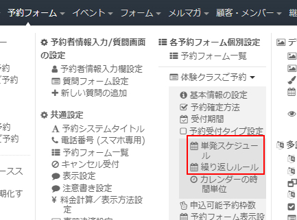 ヘッダーメニューの「予約フォーム」⇒「各予約フォーム個別設定」の「繰り返しルール」をクリックします。